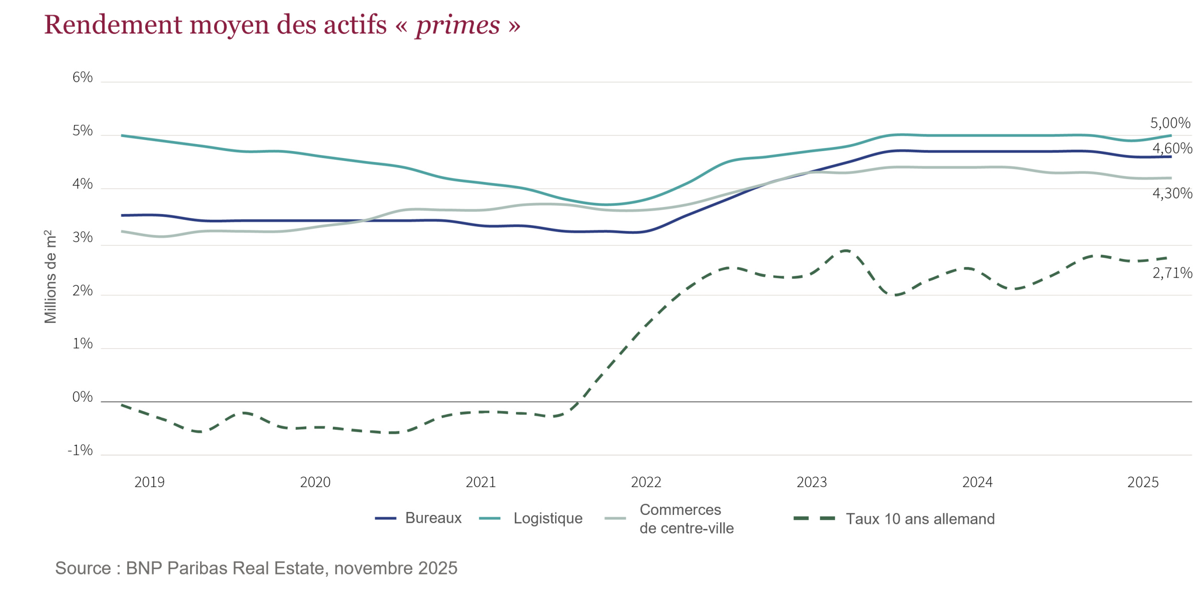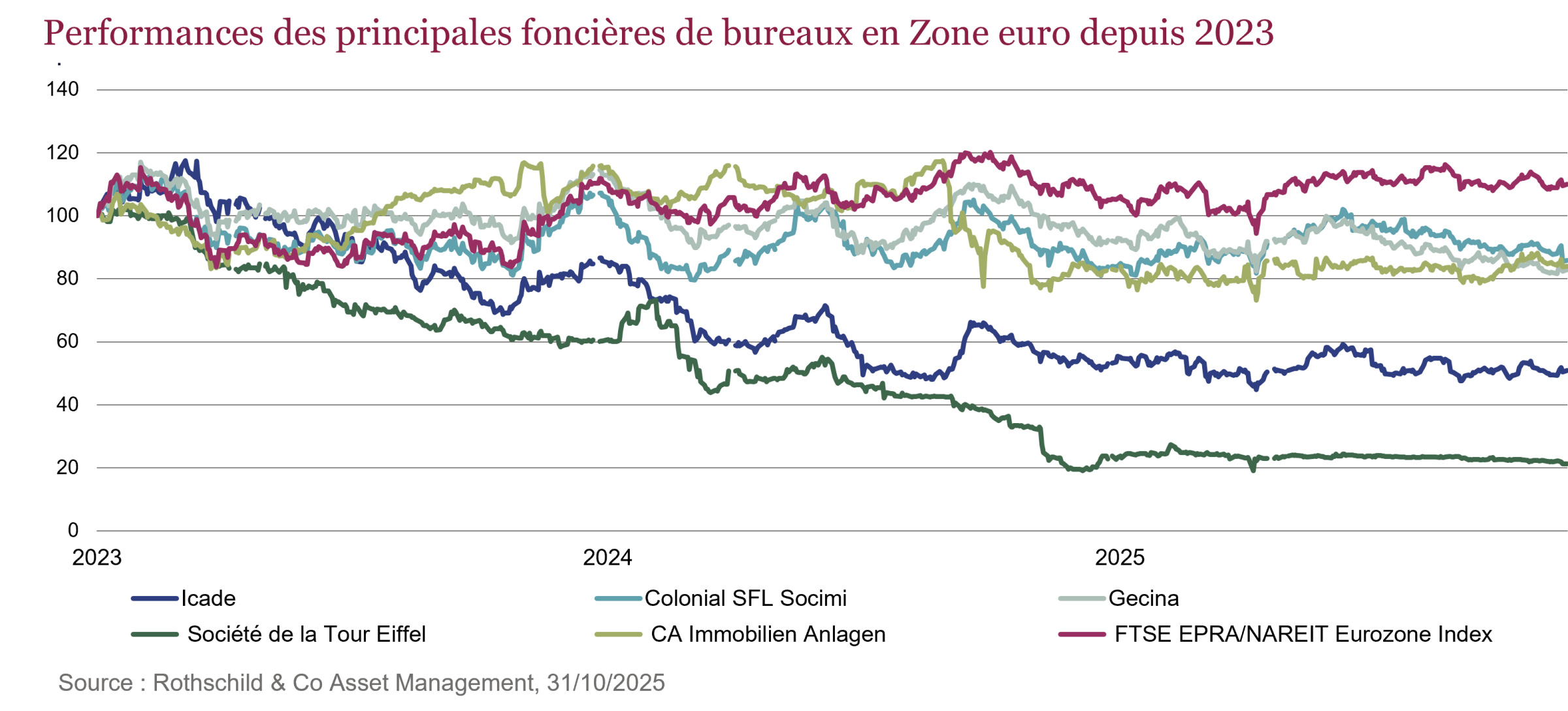 Le marché de l’investissement reflète les tendances locatives. Les bureaux n’ont représenté que 26 % du total des capitaux investis au cours des neuf premiers mois de 2025, contre une moyenne de 39 % sur les dix dernières années en Europe1. Les immeubles de secondes zones obsolètes sont invendables. Les volumes de transaction pour les meilleurs actifs restent, pour leur part, pénalisés par une prime de risque qui, en dépit de la hausse des rendements d’un peu plus de 100 points de base en moyenne par rapport à leur point bas4, reste tendue dans un contexte d’incertitude toujours forte sur l’orientation des taux longs. En bourse, la sanction est des plus sévères avec une décote moyenne de 47 % sur l’actif net des foncières de bureaux4 .