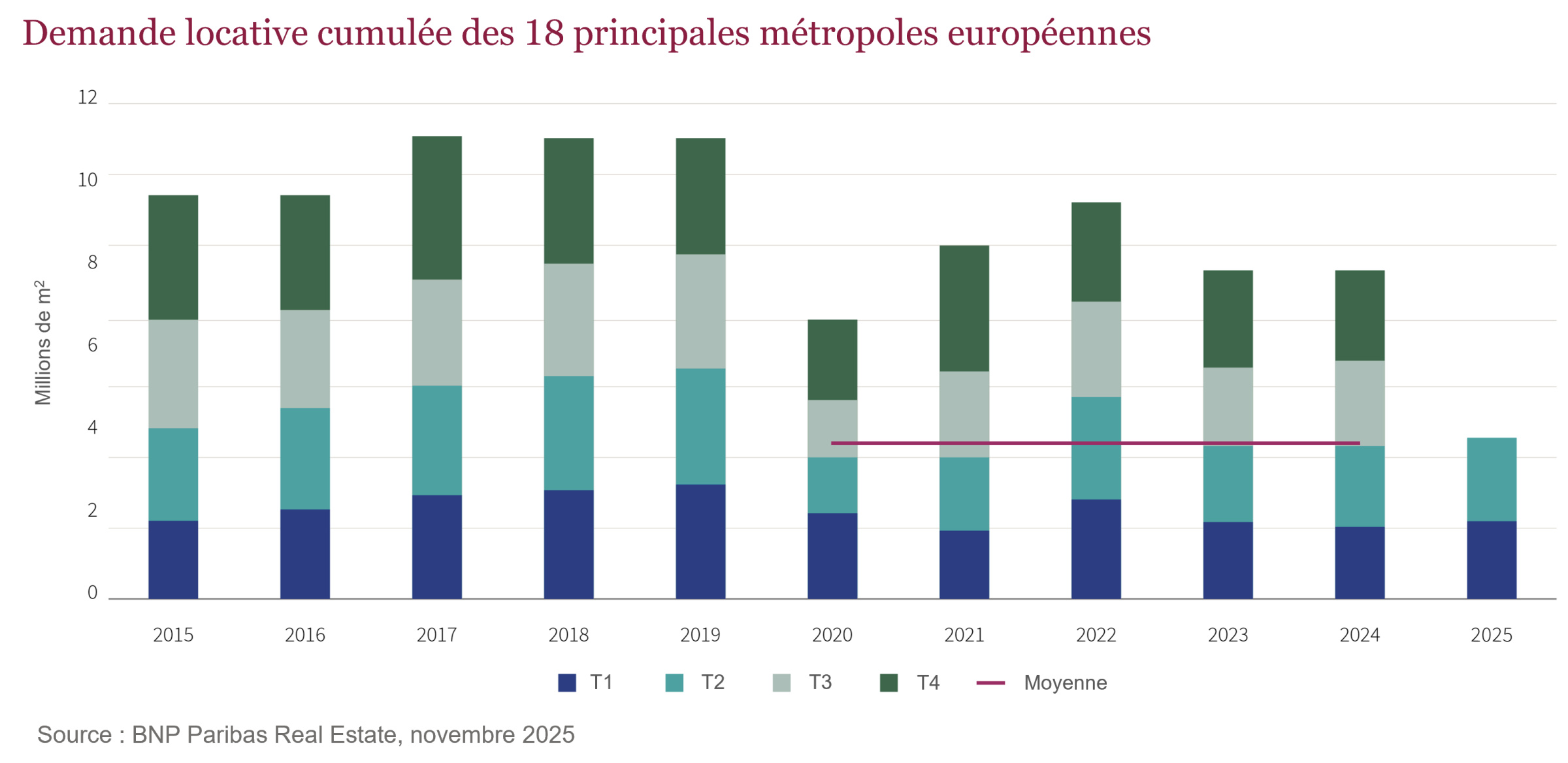 Bousculé par l’explosion du télétravail et la transition énergétique, le marché des bureaux s’est disloqué, conduisant à une baisse de la demande locative moyenne de 20 % comparée à la période pré-Covid, soit 4 millions de m², contre 5 millions de m2 en moyenne au premier semestre sur les cinq dernières années pour les dix-huit métropoles européennes recensées par BNP Paribas Real Estate 1.
