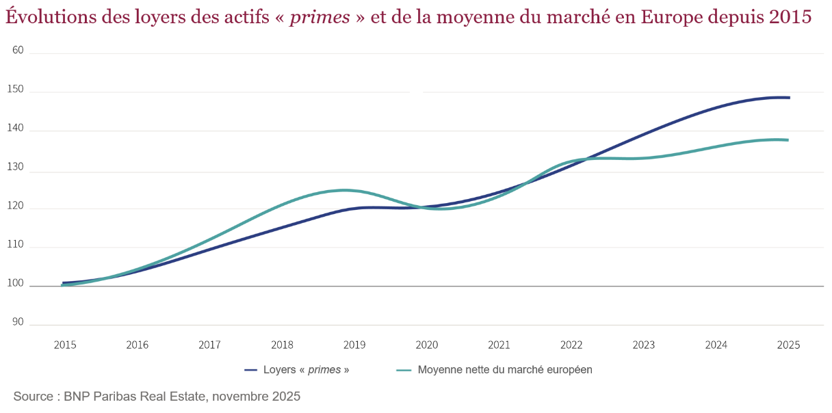 La demande locative cache toutefois une disparité forte apparue post-Covid entre les meilleurs bureaux, catégorisés « prime2 », et le reste. Pour les premiers, qui représentent l’ensemble des bureaux bien placés, c’est-à-dire, situés en centres-villes des grandes métropoles européennes et offrant les meilleures prestations énergétiques (immeubles récents et/ou rénovés), la demande locative est restée soutenue alors même que l’offre y est contrainte. Les taux de vacance des marchés de centre-villes sont ainsi très faibles (2,5 % à Barcelone, 2,7 % à Milan, 3,3 % à Munich et 4,3 % à Paris) en comparaison avec les marchés périphériques (10,7 % en moyenne)1, conduisant à une divergence de loyer significative.